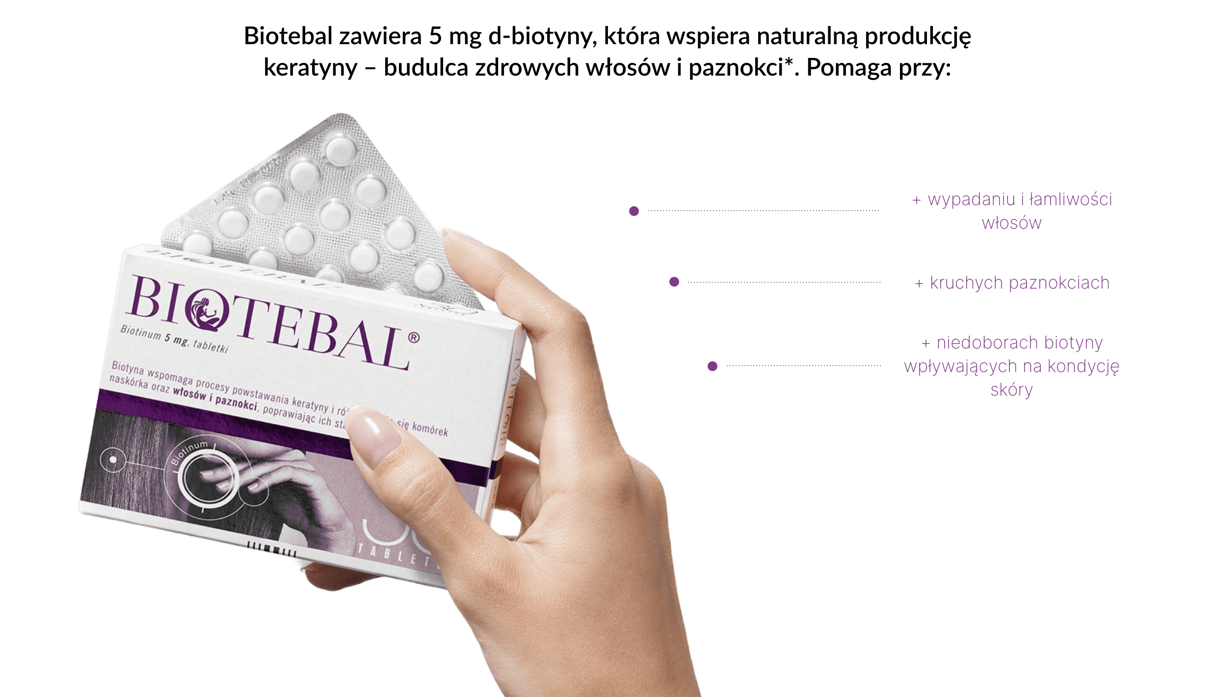 *Biotyna wspomaga keratynizację komórek takich jak np. włosy. Charakterystyka Produktu Leczniczego Biotebal Max.